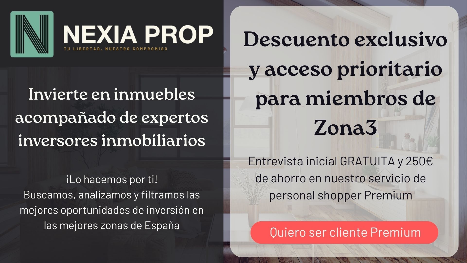 Una vez dentro de nuestra comunidad, te informaremos cada vez que abramos plazas de nuestro servicio Premium con acompañamiento y también subiremos de forma periódica oportunidades de inversión inmobiliaria. El descuento de socios de Zona3 solo aplicará para el servicio Premium y no es acumulable a otras promociones.